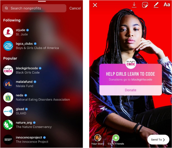 Anda kemudian dapat mencari melalui daftar nirlaba dan menyesuaikan penggalangan dana Anda menggunakan alat kreatif Instagram Stories.